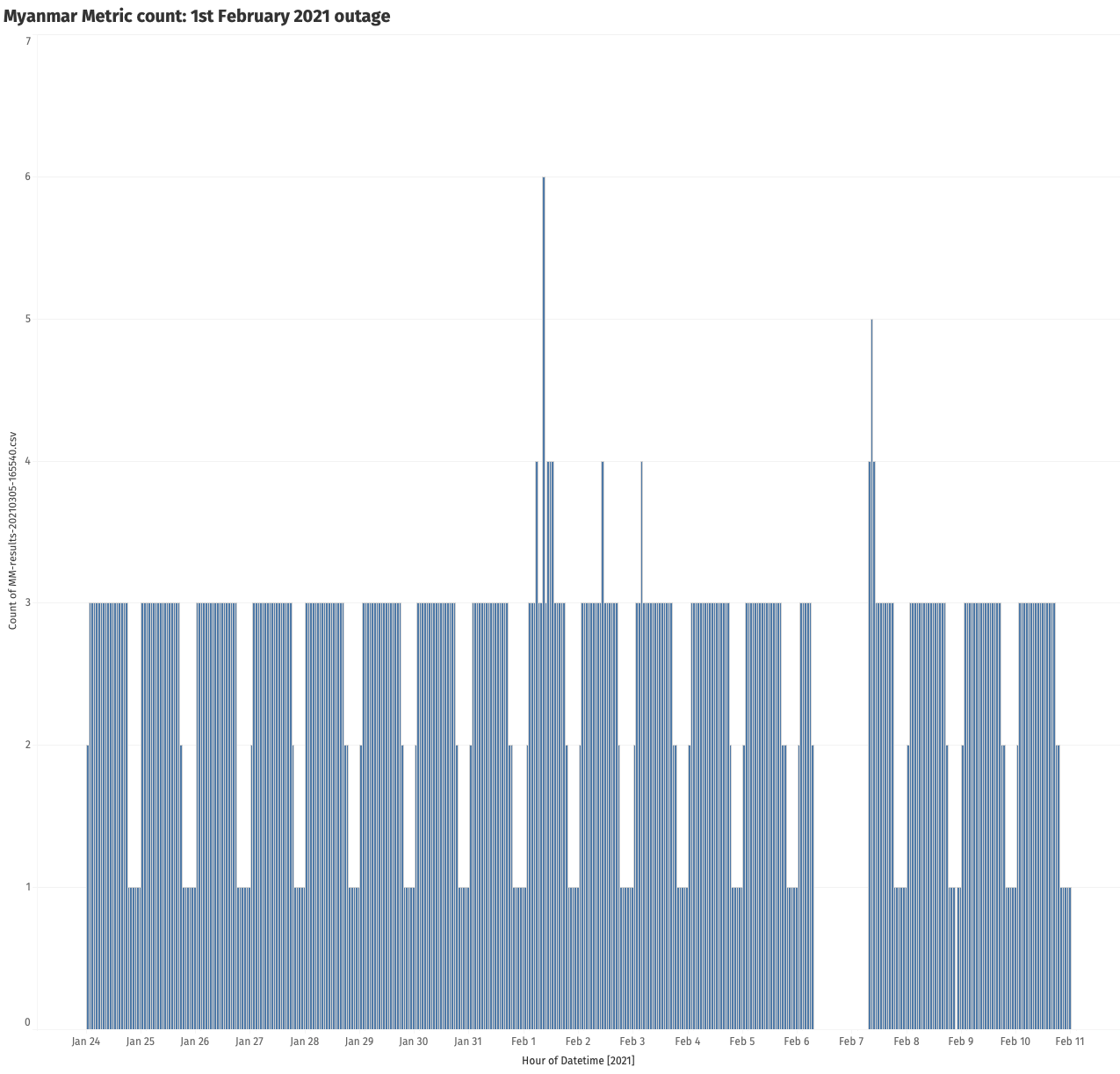 As we can see from the above chart, starting from 6th February 2021 at 06:00 UTC until 7th February 2021 at 07:00 UTC, there is a complete absence of data points, strongly suggesting that an Internet connectivity shutdown event occurred. Compared to the first Internet outage on 1st February 2021 (during which some network connectivity was still present), this second outage (on 6th February 2021) was much more severe and pervasive, as no Mozilla telemetry clients were able to report back any data.