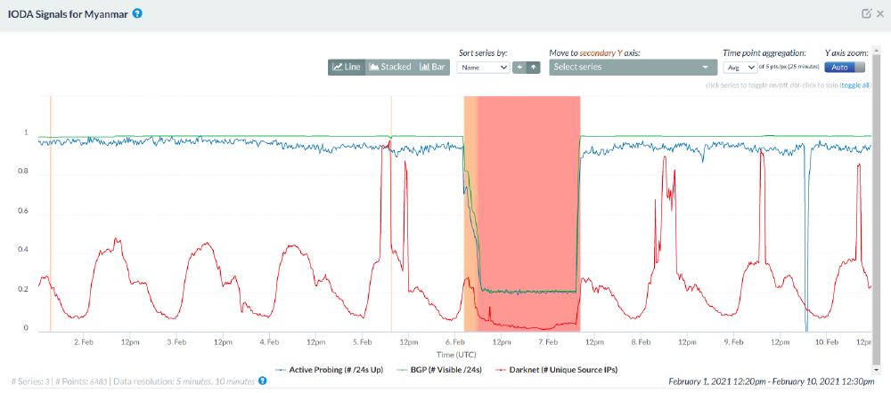 Source: Internet Outage Detection and Analysis (IODA), IODA Signals for Myanmar, https://ioda.caida.org/ioda/dashboard#view=inspect&entity=country/MM&lastView=overview&from=1612310400&until=1612915200