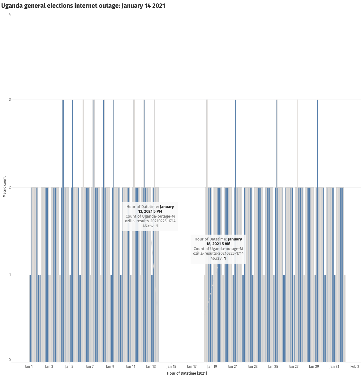 Source: Mozilla telemetry data from Uganda (January 2021): Custom chart showing the absence of Mozilla telemetry between 13th-18th January 2021.