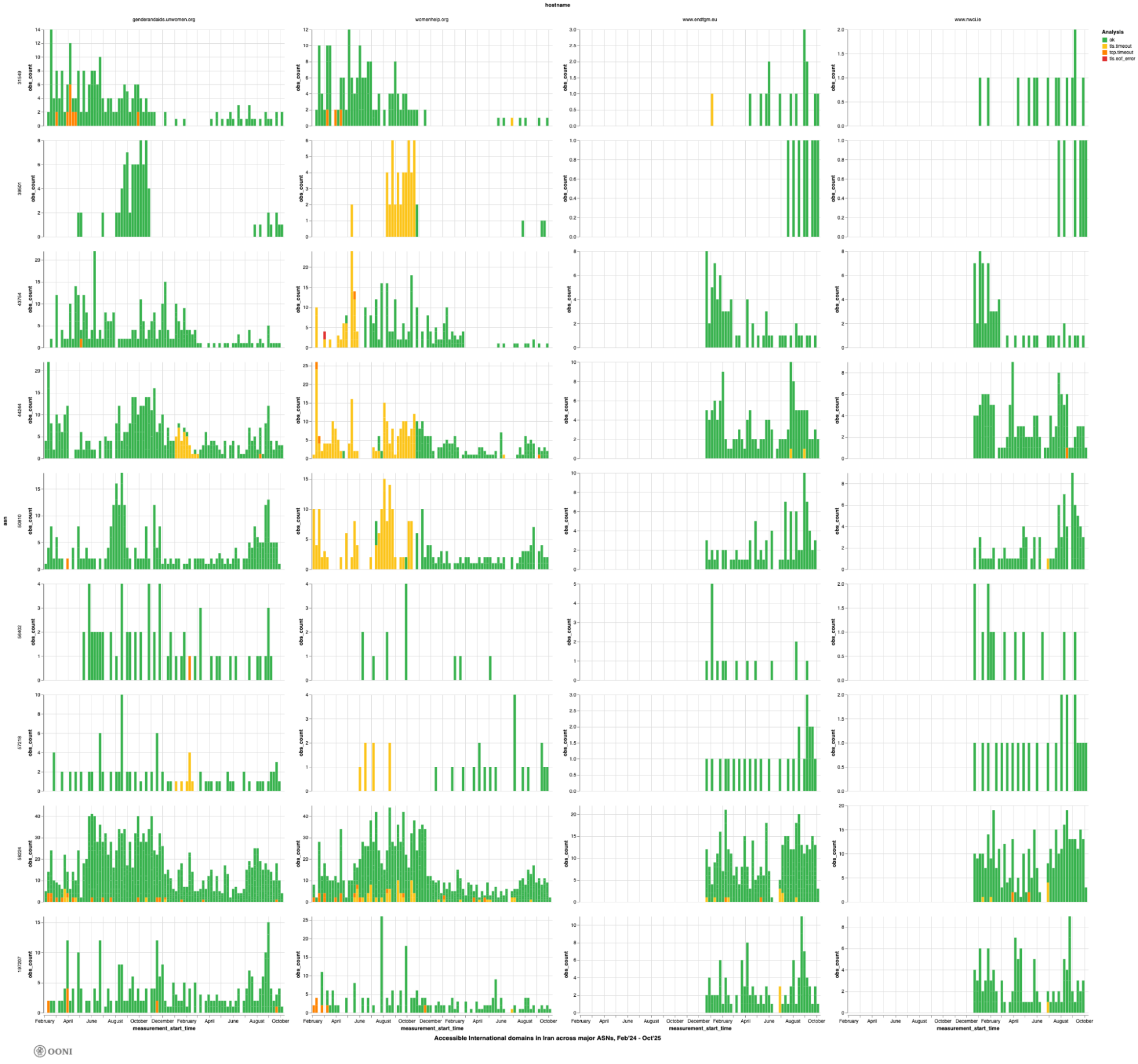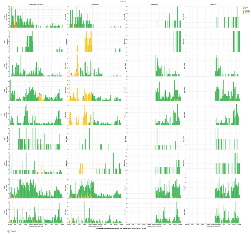 The following chart aggregates OONI measurement coverage from the testing of the blocked international women’s rights websites (listed in the above table) on multiple networks in Iran between 1st February 2024 to 1st October 2025.