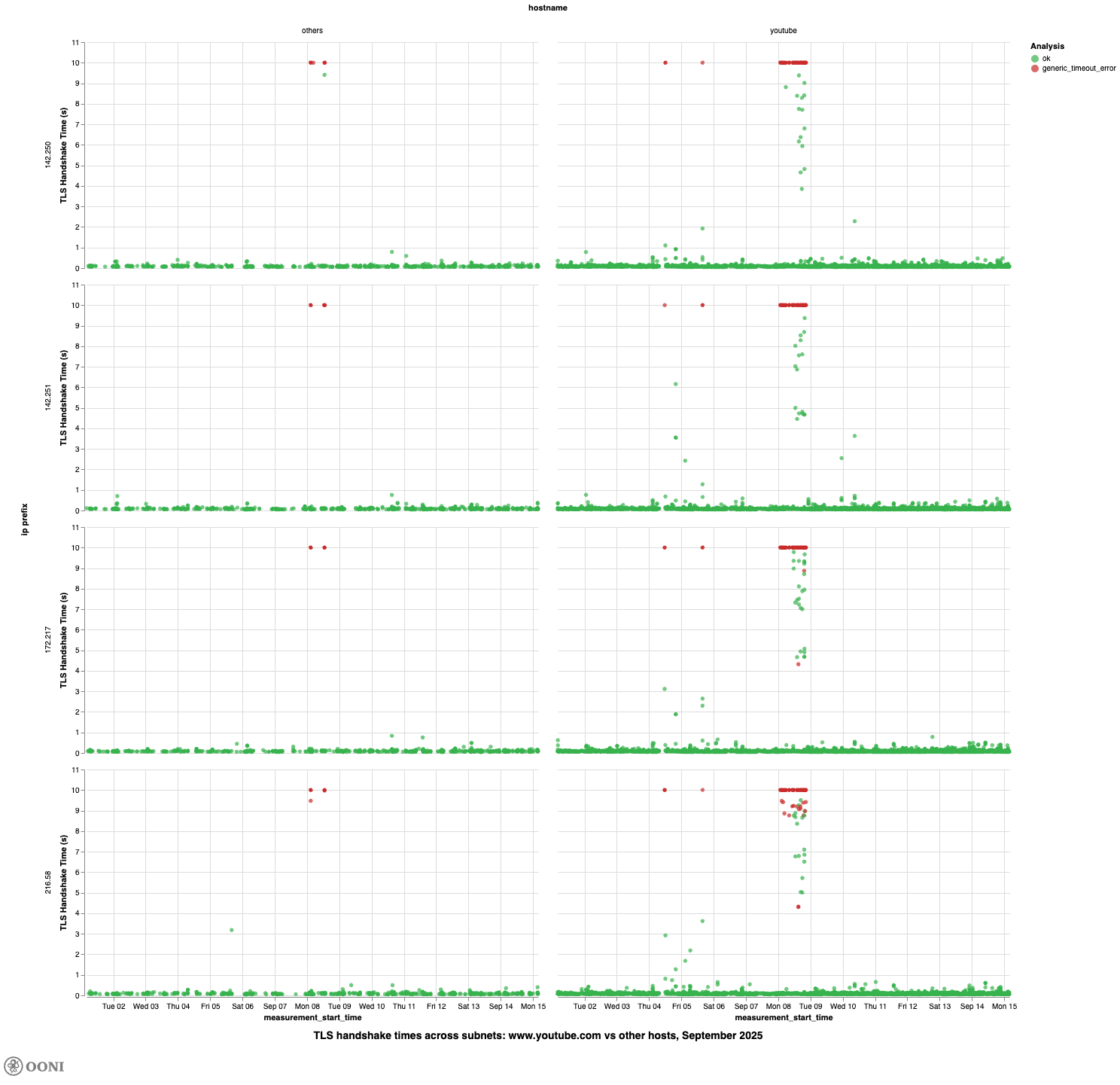 The following chart shows the TLS handshake times for www.youtube.com across each of these IP prefixes from 1st to 15th September 2025. As evident from the data, there is a significant spike in handshake duration on 8 September 2025 across all prefixes, strongly suggesting that access to YouTube was throttled on that day.