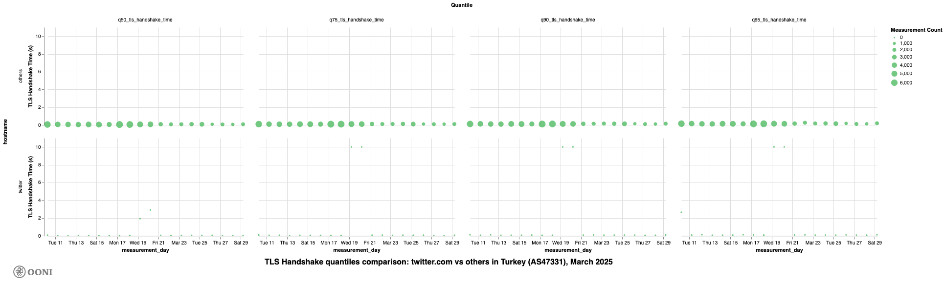 Chart: Daily TLS handshake time quantiles for twitter.com on AS47331 in Türkiye in March 2025 (source: OONI data).