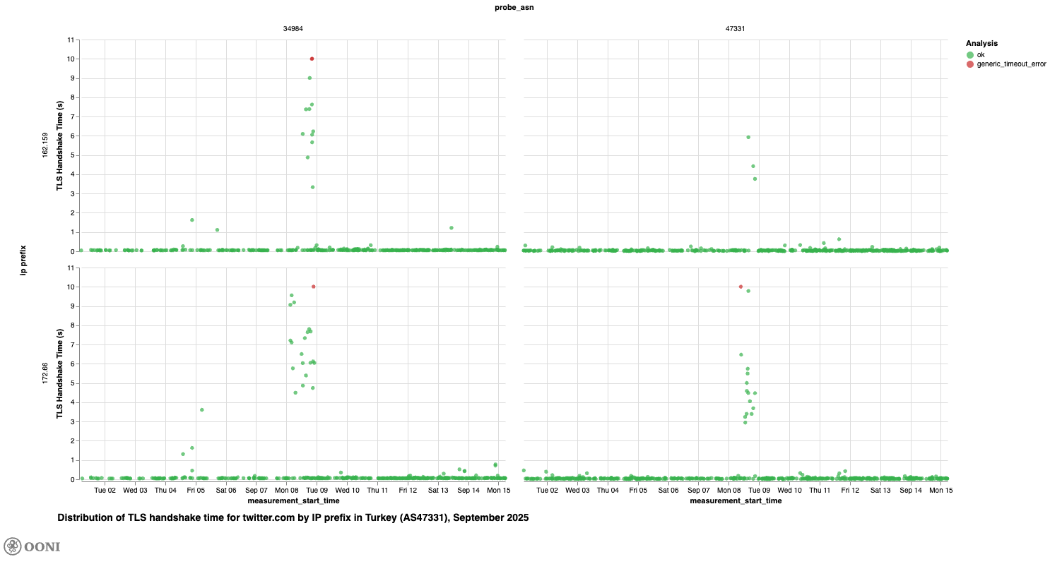 Chart: Distribution of TLS handshake times for twitter.com across major IP prefixes on AS47331 and AS34984 in Türkiye from 1st to 15th September 2025 (source: OONI data).