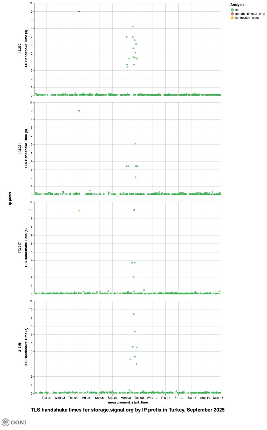 Chart: TLS handshake times for storage.signal.org on major IP prefixes in Türkiye from 1st to 15th September 2025 (source: OONI data).