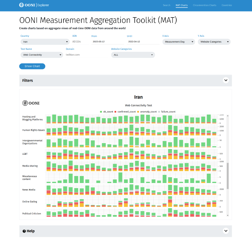 In April 2022, we launched the OONI Measurement Aggregation Toolkit (MAT)! This tool enables you to track internet censorship worldwide in real-time and create charts based on aggregate views of OONI data.