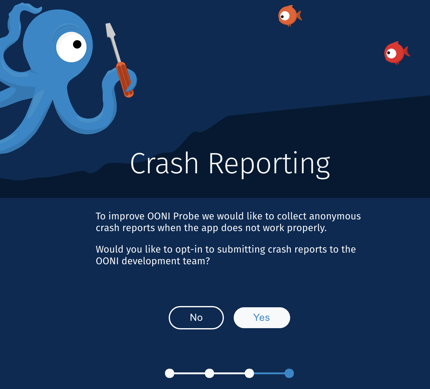 Step 6. The following screen asks you to share crash reports that can help us identify and fix OONI Probe bugs. Please click Yes to share crash reports and help us improve OONI Probe.