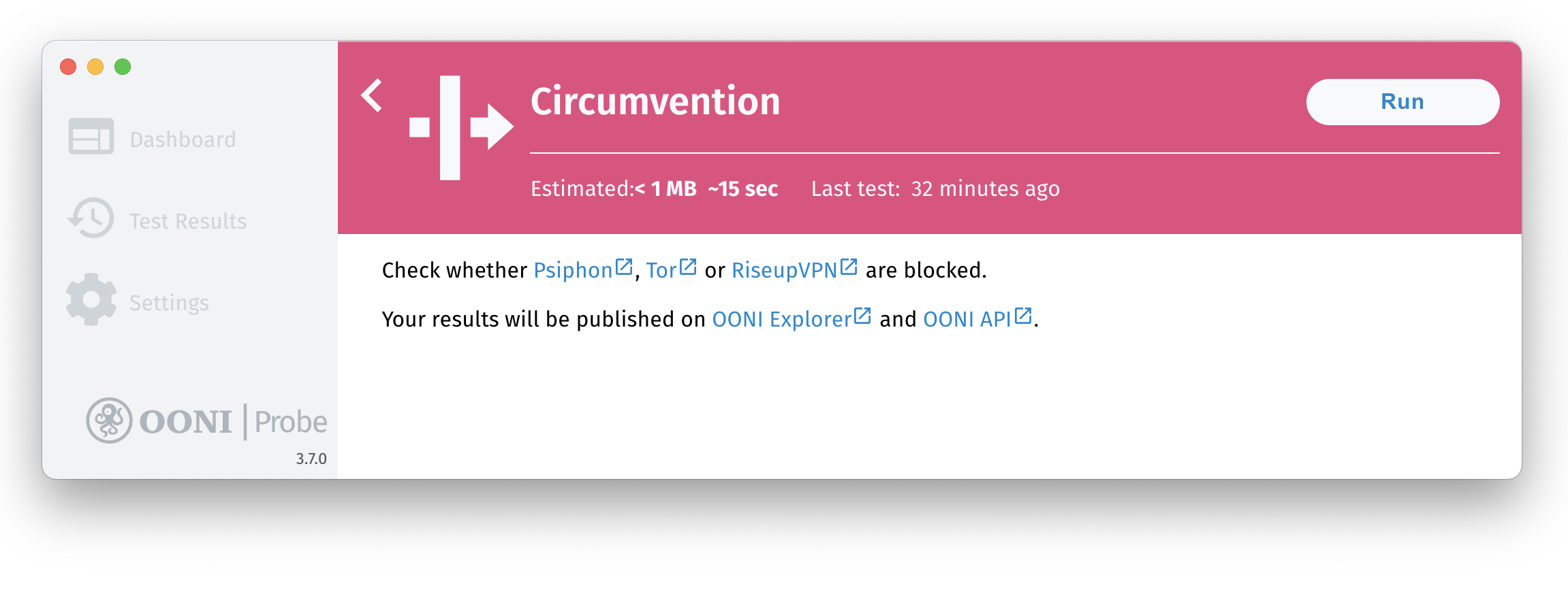 - Circumvention card. Includes OONI’s Tor and Psiphon which check if these censorship circumvention tools are blocked.